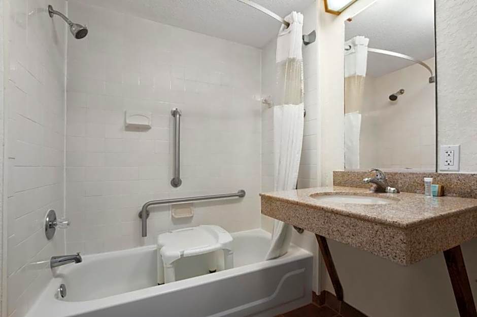This accessible room features a pool view, flat-screen cable TV, and free WiFi. The bathroom has a raised toilet and hand rails.